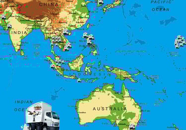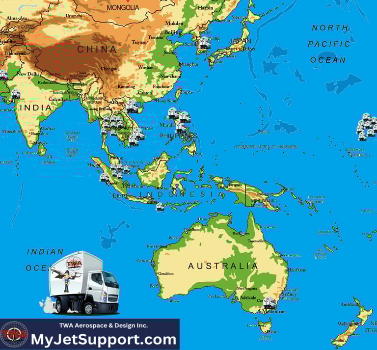 Australia (1), Bangladesh, Bhutan, Brunei, Cambodia, China, Guam, Hawaii (8), Hong Kong, India (1), Indonesia(2), Japan, Kazakhstan, Laos (1), Macau, Malaysia, Maldives, Marshal Islands, Micronesia, Mongolia, Myanmar, Nepal, New Zealand, Philippines (3), Papua New Guinea, Singapore (4), Solomons, South Korea(1), Sri Lanka, Taiwan, Thailand (7), Vietnam(2) (BOLD = Technician in Country)